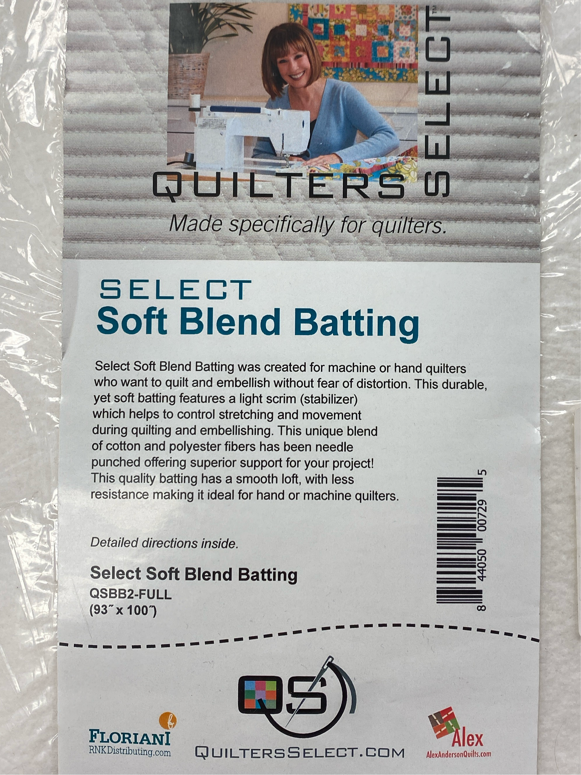 Select Soft Blend Batting by Quilters Select was created for machine or hand quilters who want to quilt and embellish without fear of distortion. This durable, yet soft batting features a light scrim (stabilizer) which helps control stretching and movement during quilting and embellishing. This unique bled of cotton and polyester fibers has been needle punched offering superior support for your project! This quality batting has a smooth loft, with less resistance making it ideal for hand or machine quilters.