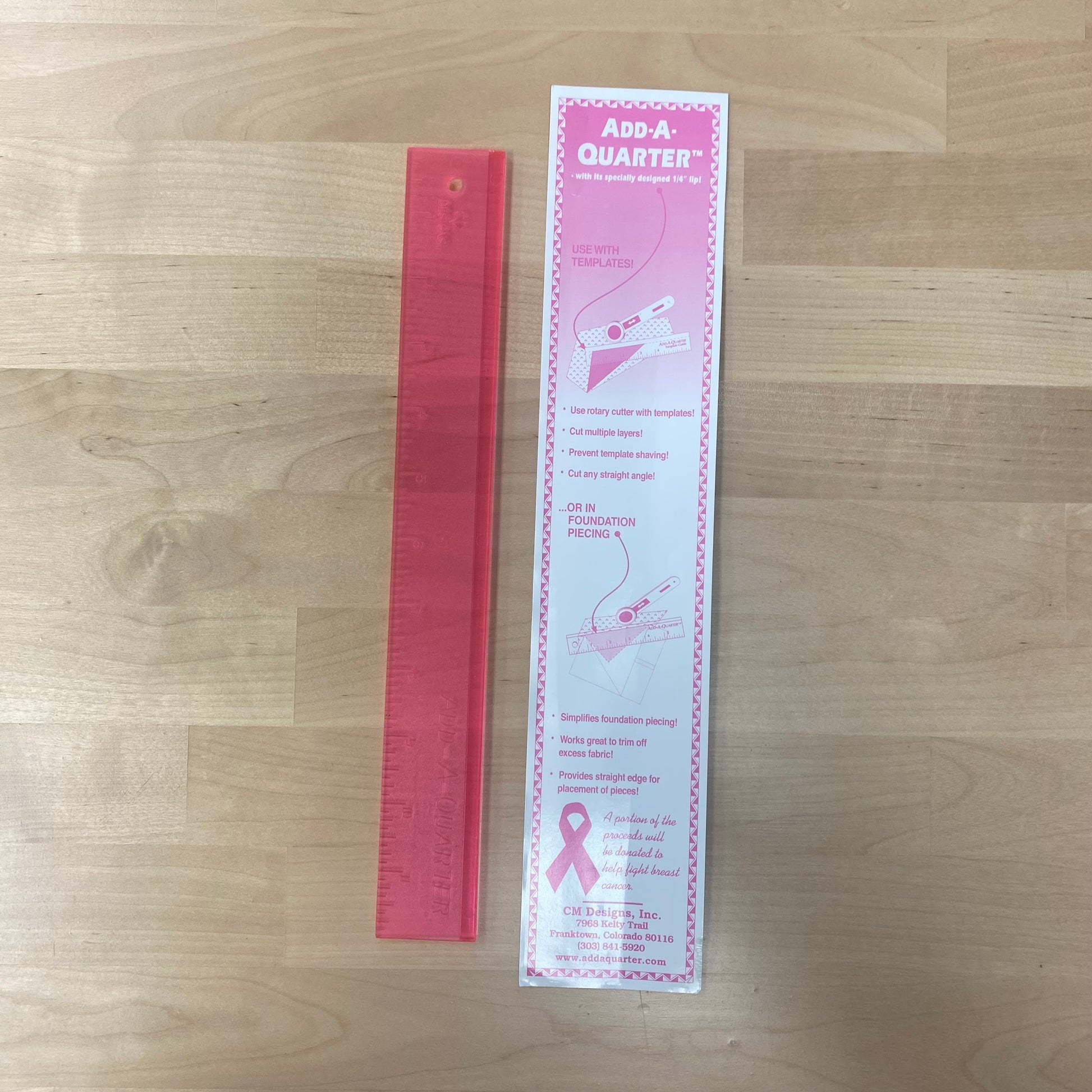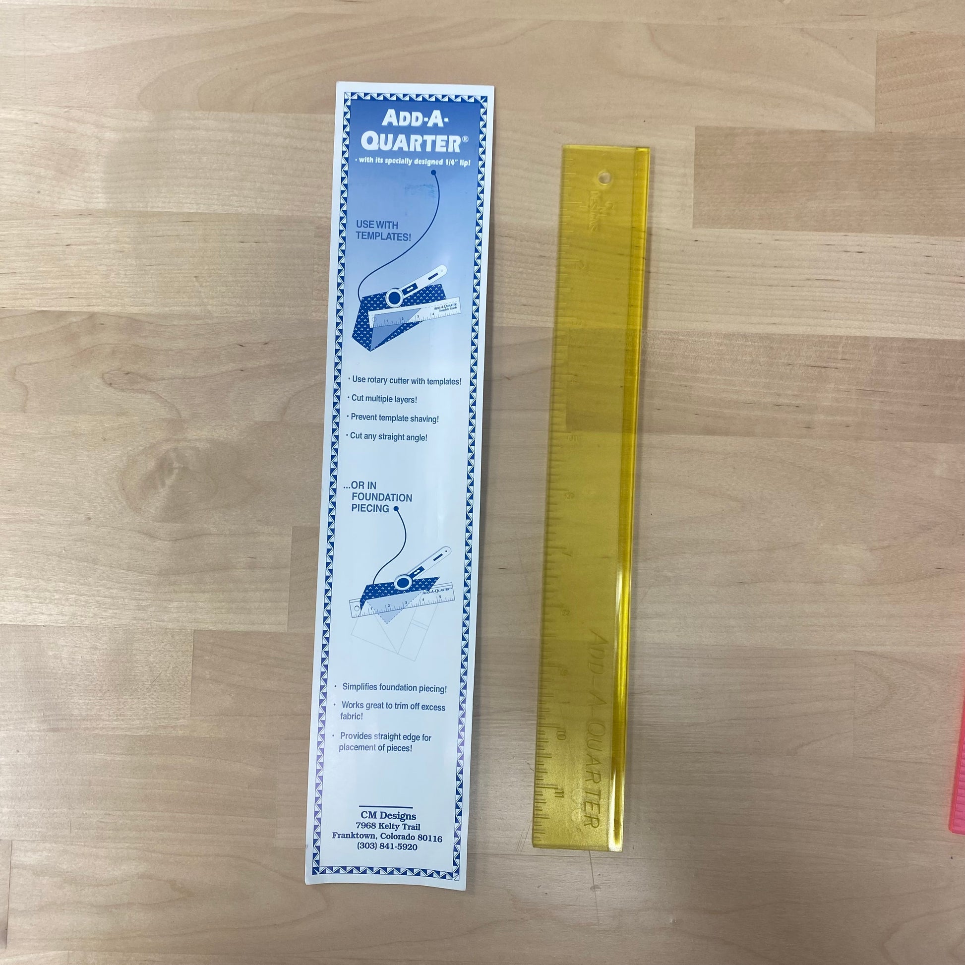 The Add-A-Quarter combines the speed of rotary cutting quilt pieces with the accuracy of using templates. Once your templates are made, the Add-A-Quarter will automatically add the customary 1/4" seam allowance to any straight angle and provide a straight edge for you rotary cutter. Use with foundation or paper piecing to remove excess fabric and create your seam line.