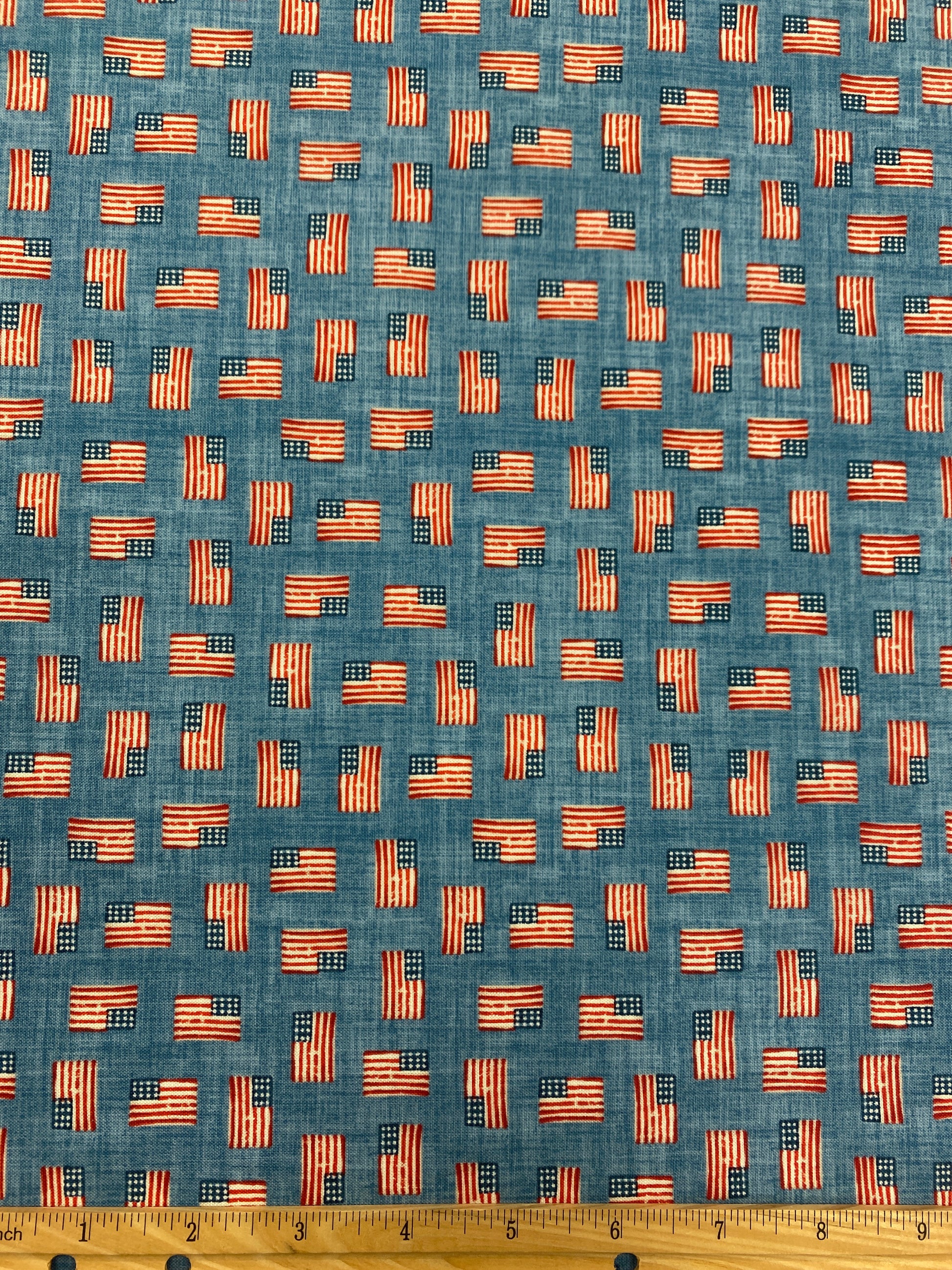 Take a road trip across the USA with this quirky light blue fabric by Studio E Fabrics! Featuring small American flags in various orientations, this fabric is perfect for showing off your patriotic side while adding a touch of playful fun to any project. (Land of the free, home of the stylish!)