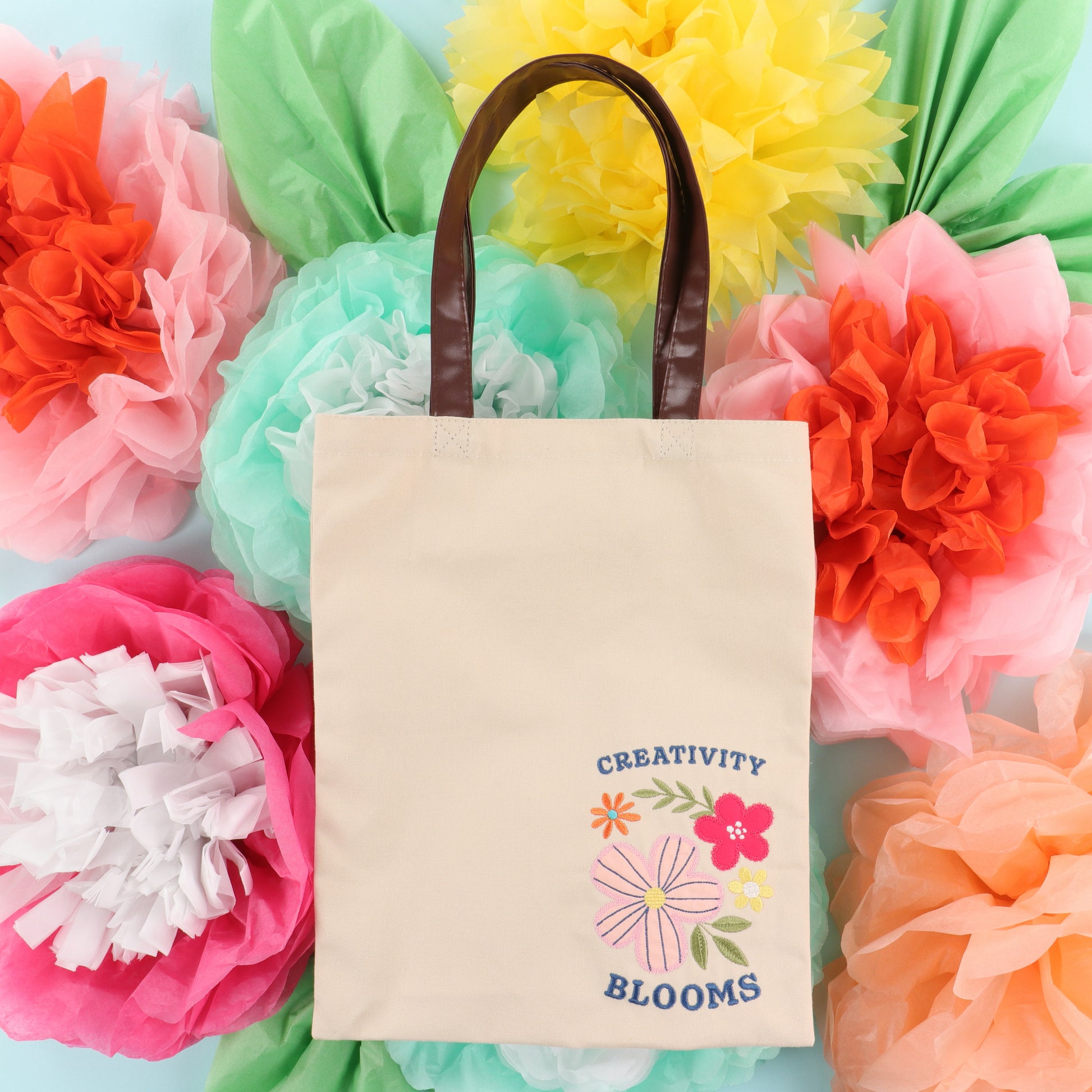 Kimberbell's Canvas Tote Blank features faux leather handles and serged, open side seams for easy hooping. Add your favorite design, then sew up the sides with a simple straight stitch! Made from a lovely canvas fabric, this versatile tote blank finishes at a roomy 12 x 14.75" size.
