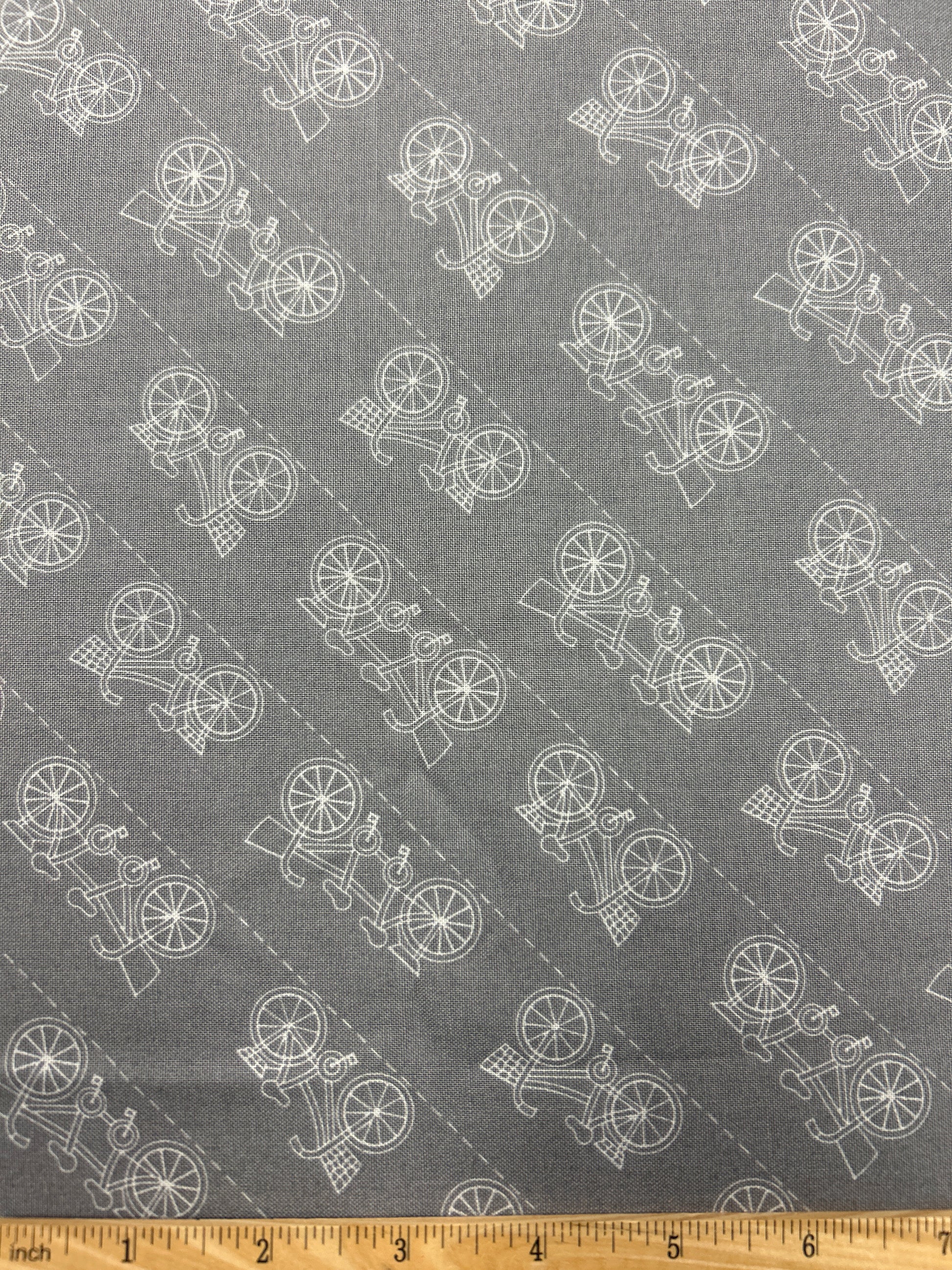 Ride in style with this quirky vintage boardwalk fabric! Designed by Kim Christopherson for Maywood Studio, the gray fabric features a playful print of white bikes on diagonal dash lines. Perfect for adding a fun touch to any sewing project.