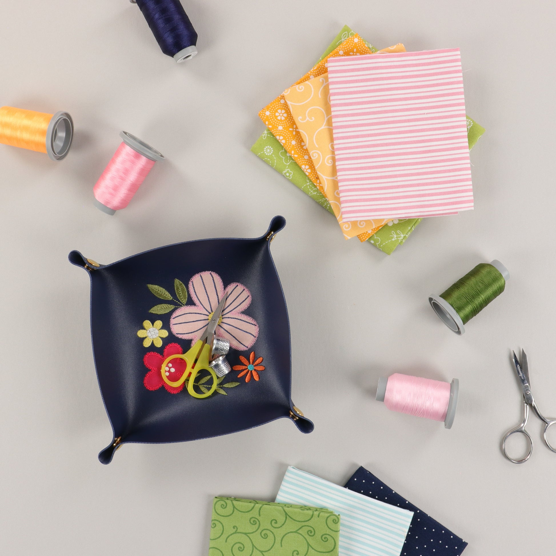 Create easy gifts and decor with Kimberbell Snap Trays! Made from faux leather PVC, these embroiderable blanks easily snap together to form a tray. Add your favorite design, then snap the corners together! This pack includes one mint and one navy tray.