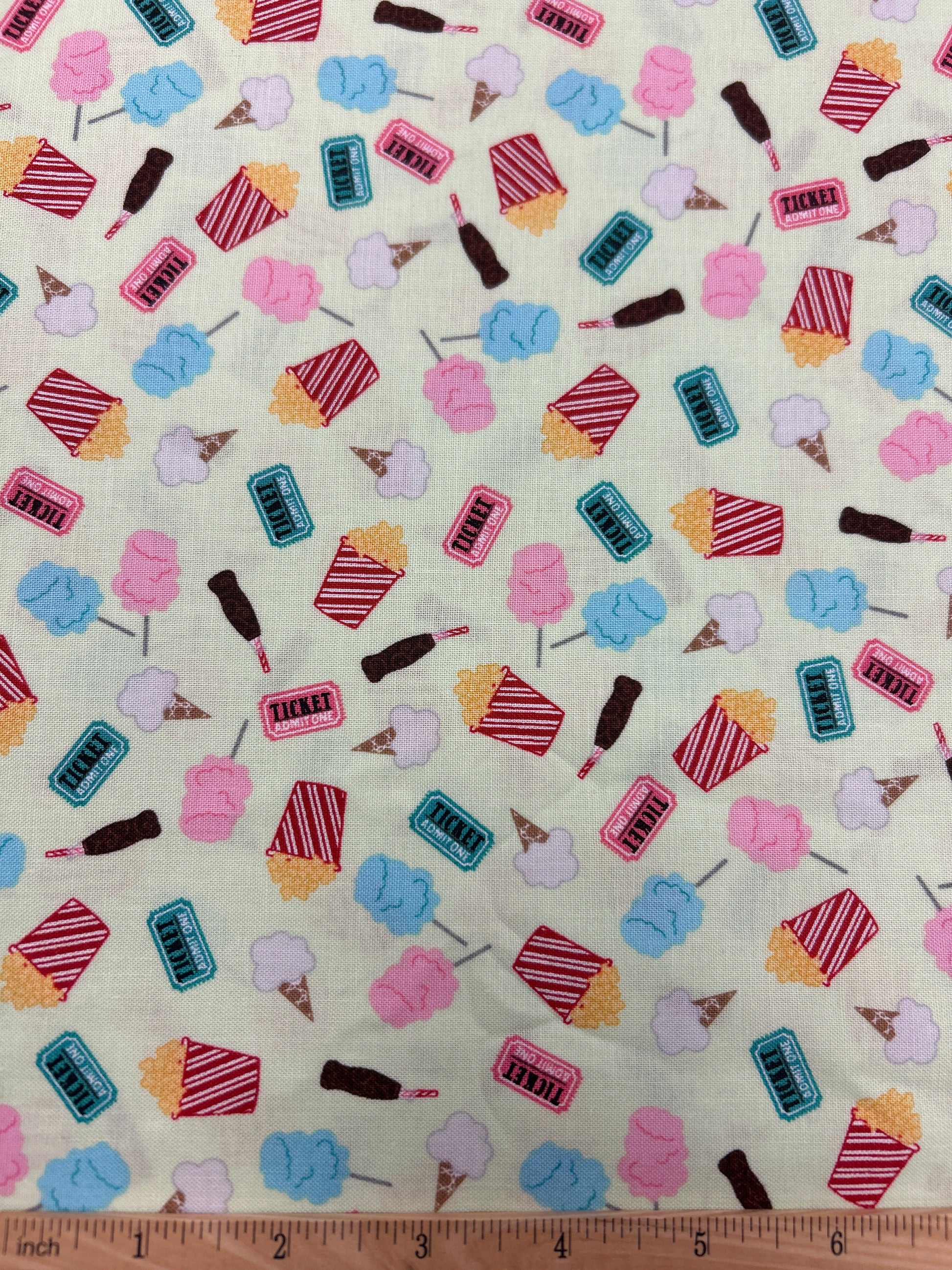 Get ready to indulge in some Fun Snacks on Green - Vintage Boardwalk! Designed by Kim Christopherson for Maywood Studio, this playful green fabric features all your favorite carnival treats - popcorn, cotton candy, tickets, soda, and ice-cream. Perfect for adding a touch of quirkiness to your next sewing project!