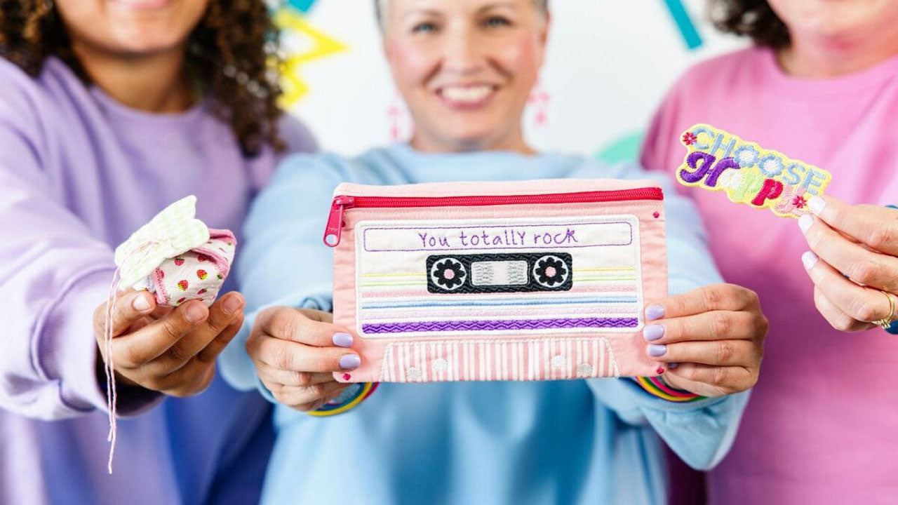 At Kimberbell’s Stitchin’ Rewind: 80’s Edition event, you’ll make three nostalgic projects from the 1980s! Create a Mixtape Zipper Pouch and Strawberry Gift Bag in-the-hoop, then stitch a Choose Happy Patch to pin to your jelly vinyl event bag! With vibrant colors, alternate designs, and totally tubular techniques, our one-day event is where machine embroiderers go when they just wanna have fun.